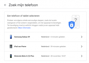 Vanaf “Zoek mijn telefoon” kun je overigens heel veel dingen doen: je kunt de telefoon laten bellen, ook als hij op stil staat (handig als je denkt dat hij gestolen is en nog in de buurt is). Je kunt hem locken zodat hij niet meer gebruikt kan worden (maar je hem wel kunt blijven volgen). Je kunt hem helemaal leeggooien op afstand als je verwacht dat hij écht in verkeerde handen is gevallen en hij niet meer terug komt.