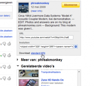 Dat het herontwerp van de YouTube webpagina’s nu definitief is en ook mij inmiddels bereikt heeft is het slechte nieuws. Door het herontwerp zijn namelijk alle twee de opties die ik had om YouTube video’s te downloaden tijdelijk of permanent verdwenen. Ik had een Greasemonkey script draaien dat perfect was. In elke pagina kreeg ik een of meerdere download links voor de MP4 versie van de video. Was de video beschikbaar in hoge kwaliteit, dan kon ik hem ook in hoge kwaliteit downloaden. De andere route, die ik voornamelijk gebruikte als ik meer geïnteresseerd was in de audio van de video, was Dirpy. En daar staat nu de boodschap dat ze bezig zijn aan het repareren van de download opties. Ik hoop dat het ze lukt. Maar gelukkig is het YouTube niet gelukt om alle opties weg te vegen.