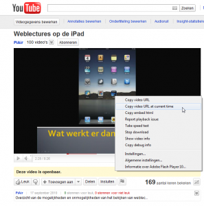 Mooi dat is dat je voortaan niet meer hoeft te onthouden hoe je dat moet doen. Dat doet YouTube voor je. Als je namelijk met de rechtermuisknop klikt op de player dan krijg je nu ook de optie “Copy video URL at current time” te zien. De URL die dan naar het klembord gekopieerd wordt en die je bijvoorbeeld in een mail of een webpagina kunt gebruiken, heeft dan al meteen die toevoeging.