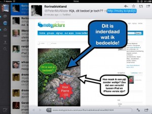 Ik kan nu eenvoudig de screenshot die ik op de iPad gemaakt heb, openen in Photogene, daar kan ik naar wens pijlen en toelichting toevoegen. Daarna kan ik de afbeelding o.a. (lijstje is niet compleet) opslaan op de iPad, posten via Twitter, uploaden naar Flickr, uploaden via FTP, en direct mailen. Handig, precies wat ik nodig heb en niet kon vinden via Google. Twitter blijft een handige plek om te vertoeven. Dank je Florina!