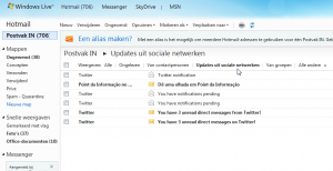 Maar toen viel het me op dat Hotmail in haar interface een extra optie heeft. Bij het Postvak IN staat ook “Updates uit sociale netwerken” (zie ook de screenshot) als filteroptie. En als ik daar op klik, dan wordt ook het bericht getoond dat helemaal niet van Twitter afkomstig is. Vreemd genoeg werden er ook een aantal andere getoond waarvan ik niet eens wist dat ik die gehad heb.