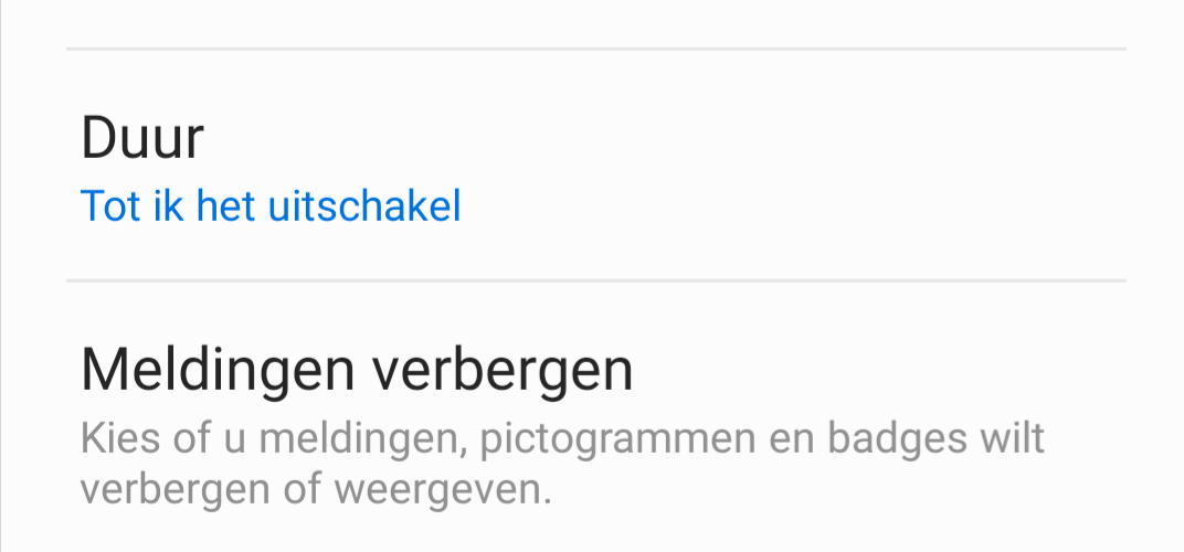Afgelopen week heeft de telefoon de hele week handmatige op Niet storen gestaan. En dat was heel fijn. Ik had daarbij aangegeven dat meldingen van apps niet op het lockscreen of via de meldingen bovenin het venster weergegeven mochten worden, een agendanotificaties, niets.