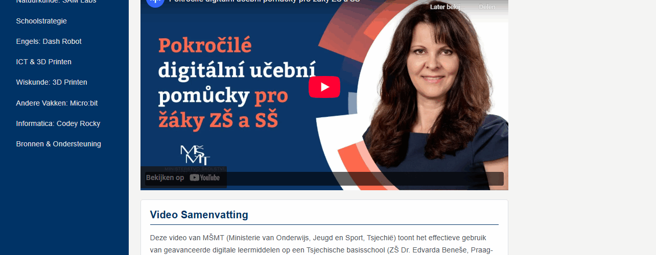 Het hoofd van het afdeling Digital Education Support (Anna Stočesová Martinková) toonde tijdens het bezoek een video waar zij zelf ook in voor komt. In het Tsjechisch, zonder ondertiteling. Sterker nog, op YouTube staat de optie voor ondertiteling uit. Wij konden tijdens het bezoek de video volgen omdat er voor twee tolken gezorgd was die alles wat er in het Engels danwel Tsjechisch gezegd werd simultaan vertaalden. Ook indrukwekkend, maar voor een blogpost wat minder haalbaar. En dat is jammer, want ik wilde de video heel graag delen omdat hij (weet ik inmiddels) gewoon een mooi overzicht geeft van de school. Ik weet het, het is geen onafhankelijk filmpje, maar daar ging het me ook niet om, neem de inspiratie en realiseer je dat vast niet alles perfect of probleemloos verloopt.