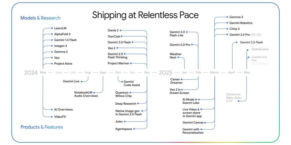 📅Een andere dia waar mensen (terecht) van onder de indruk waren, is die met het aantal (LLM-)modellen dat Google het afgelopen jaar uitgebracht heeft. Er is nog het nodige te wensen en te ontwikkelen, maar uit ervaring weet ik dat ze voor steeds meer taken nuttig worden, en zoals het bericht dat Pedro De Bruyckere gisteren deelde laat zien, daar kan het onderwijs ook veel voordeel aan hebben.