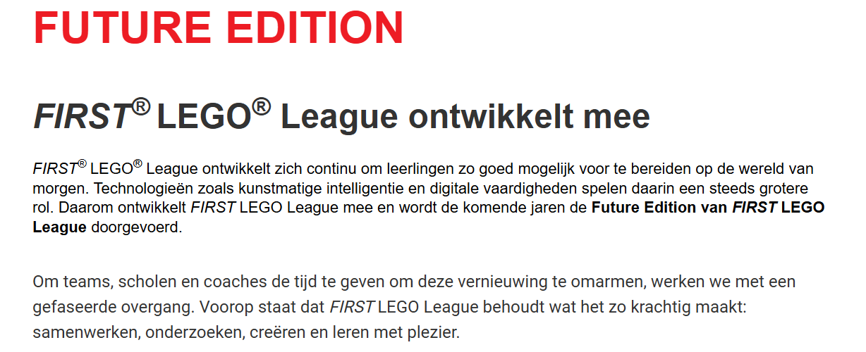 Voor First Lego League betekent het dat dit jaar en de 2 editie hierna, teams nog gewoon met de bestaande hardware (LEGO SPIKE Prime/EV3/Mindstorms) mogen werken, en dat het idee is dat daarna (de pagina’s houden nog een kleine slag om de arm) iedereen over is naar de nieuwe hardware.