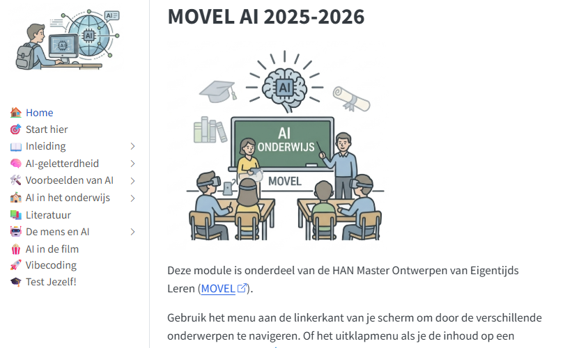 Elk jaar maak ik als onderdeel van mijn AI les bij de HAN Master Ontwerpen Van Eigentijds Leren (MOVEL) een ondersteunende module met achtergrondmaterialen voor de studenten. Om de simpele reden dat er veel meer te vertellen, lezen, bekijken is op dit vlak dan dat in 2 contacturen past. En het is ook niet zinvol om dat allemaal in een monoloog van een docent te verpakken.